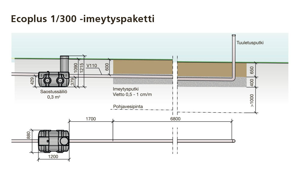 Ecoplus 1/300-imeytyspaketti soveltuu kantovesillä varustetun mökin tai saunan pesuvesien käsittelyyn. Saostustilavuus on 300 litraa.