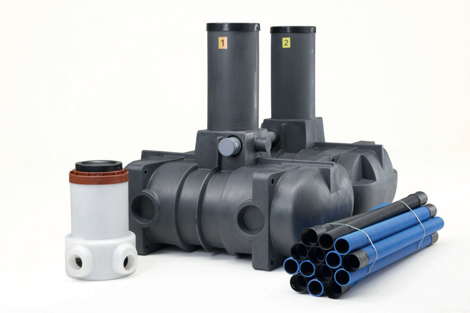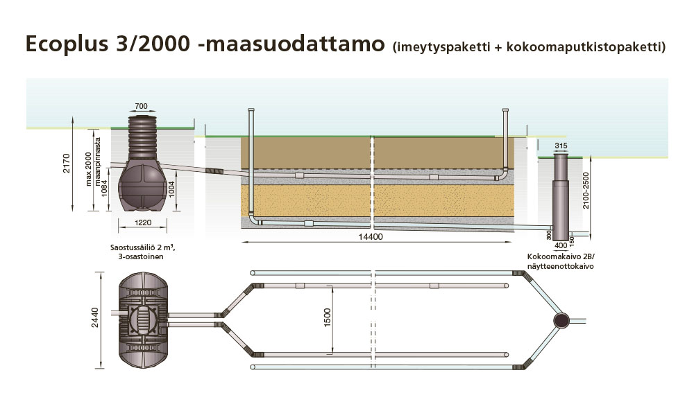 - sisältää kolmeosastoisen 2000 litran saostussäiliön (1000+500+500), tarvikkeet imeytyskentän rakentamiseen, putkistopaketin, jakokaivon ja Ecoplus-kokoomaputkistopaketin. Tällöin imeytysputkien ja suodatuskerroksen alle asennetaan keruuputkisto ja linjan päähän kokoomakaivo, josta suodattunut vesi ohjataan sopivaan purkupaikkaan.