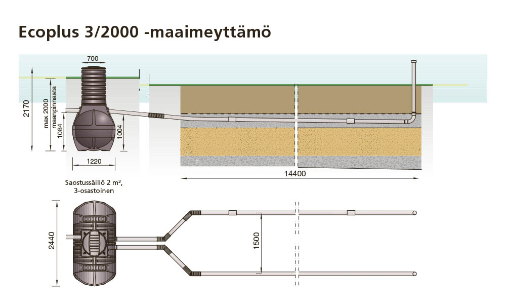 Ecoplus 3/2000 XTRA imeytyspaketti on tarkoitettu 1-6 hengen talouden kaikkien jätevesien käsittelyyn sisältäen pesu-, pyykki-, tiski- ja WC:n vedet. Tuloyhde on vain 76,5 cm säiliön pohjasta, mikä mahdollistaa asennuksen hankalaankin paikkaan.