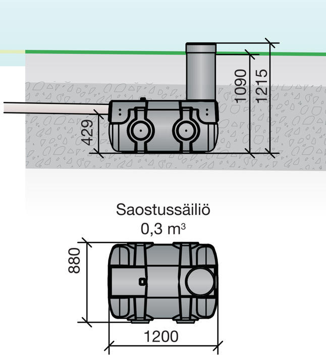 Ecoplus Saunakaivo Plus soveltuu kantovesillä varustetun saunan pesuvesien imeytykseen. Säiliön tilavuus on 300 litraa ja säiliön pohjassa on valmis rei’itys, jonka kautta vesi imeytetään säiliön ympärille asennettavaan sorapatjaan.