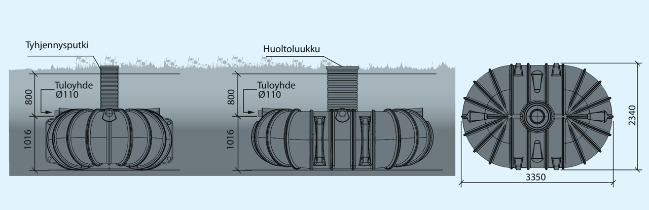 Säiliössä on liitäntämahdollisuudet joka sivulla, joten säiliön sijoittaminen tuloviemäriin nähden sujuu helposti. Myös kahden säiliön kytkeminen ja säiliötilavuuden tuplaaminen onnistuu vaivatta. MX-Luja lokasäiliö on helppo ankkuroida ankkurointikankaalla, joka oikeanlaisen täyttömaan kanssa sitoo säiliön tasaisesti paikoilleen.