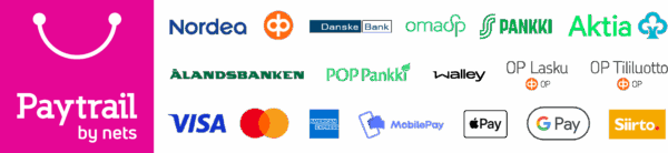 Maksunvälityspalvelun toteuttajana ja maksupalveluntarjoajana toimii Paytrail Oyj (2122839-7) yhteistyössä suomalaisten pankkien ja luottolaitosten kanssa. Paytrail Oyj näkyy maksun saajana tiliotteella tai korttilaskulla ja välittää maksun kauppiaalle. Paytrail Oyj:llä on maksulaitoksen toimilupa. Reklamaatiotapauksissa pyydämme ottamaan ensisijaisesti yhteyttä tuotteen toimittajaan.